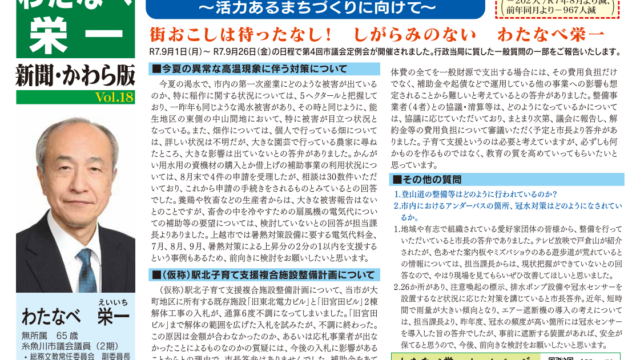 かわら版新聞・かわら版 Vol.18 糸魚川市議会議員・渡辺栄一の活動報告。10月~11月に市内13地区で開催された久保田市長との地区懇談会の様子、(仮称)駅北子育て支援複合施設の建設中止に伴う解約金39,394,300円、旧東北電力ビル解体工事の随意契約への変更について報告します。 2025.12.25かわら版