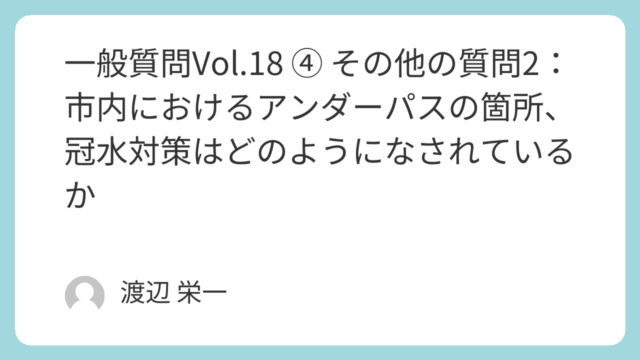 一般質問一般質問Vol.18 ④ その他の質問2:市内におけるアンダーパスの箇所、冠水対策はどのようになされているか 糸魚川市内26箇所のアンダーパス冠水対策の現状。注意喚起標示、排水ポンプ、冠水センサー設置状況を報告。短時間豪雨増加に対応するエアー遮断機導入の検討を市に要望。市議会質疑より。 2025.09.30一般質問全ての記事