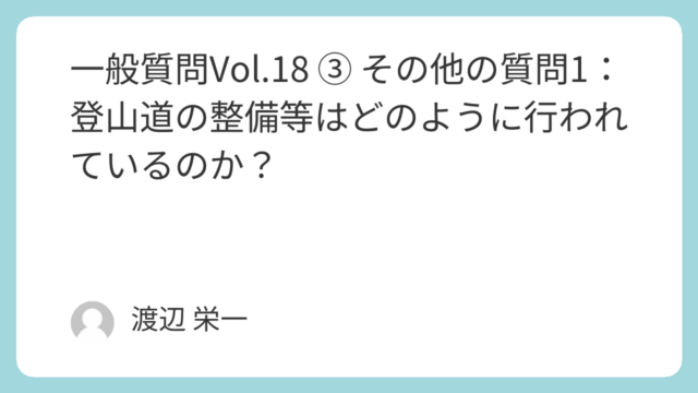 一般質問一般質問Vol.18 ③ その他の質問1:登山道の整備等はどのように行われているのか? 糸魚川市内の登山道整備は愛好家団体が実施。テレビで紹介された戸倉山の色あせた案内板、荒れたミズバショウ遊歩道の現状把握と改善を市に要請。市議会での質疑応答を報告。 2025.09.30一般質問全ての記事
